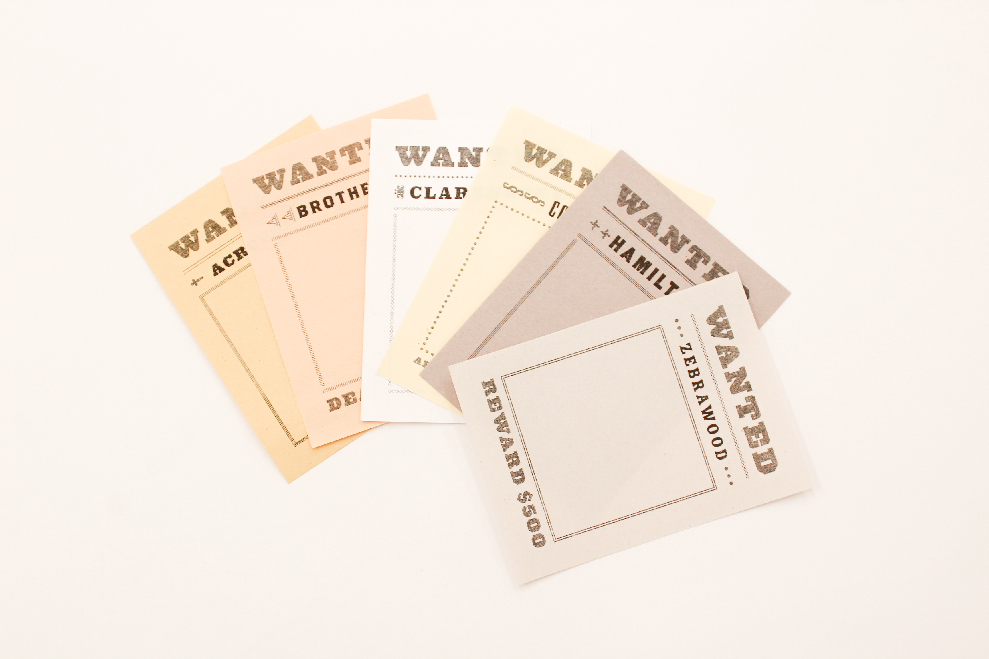 Pick a WANTED poster card → Identify the typeface that it is “Wanting” → Find the right wood block → Roll ink on the block → stamp to WANTED poster card! → Use clothespin → Hang on wood stand to dry → Walk around & pick up later!